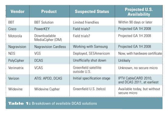 在10年前,每個(gè)芯片在生產(chǎn)過(guò)程中設(shè)置一個(gè)唯一的ID號(hào)是一個(gè)難以做到的事情,而且非常昂貴,機(jī)頂盒作為一個(gè)軟硬件高度集成的設(shè)備不具備DCAS的運(yùn)行環(huán)境。換句話說(shuō),DCAS的實(shí)現(xiàn)需要一個(gè)類似現(xiàn)在智能終端的綜合產(chǎn)業(yè)環(huán)境,但DCAS生不逢時(shí),這就注定了美國(guó)當(dāng)時(shí)DCAS在很大程度上處于探討階段。從Bruce Bahlmann的文章中一個(gè)表格可以看出,有眾多聲稱能夠提供DCAS的公司,但基于傳統(tǒng)的軟硬件捆綁的嵌入式系統(tǒng),實(shí)際進(jìn)展非常緩慢。