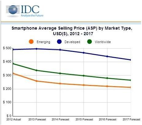 10億這個數字相比2012年全球智能手機出貨量整整增長39.3%,這樣的增長速度對于已經趨于飽和的智能手機市場來說是非常驚人的,原因是智能手機價格大幅下降,見上圖。