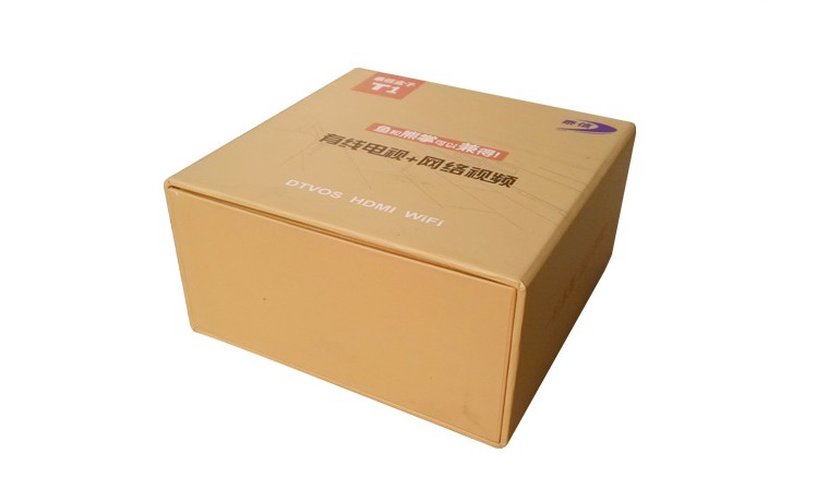 泰信盒子T1包裝盒采用銅版紙裱面,左上角為產品品名“泰信盒子T1”,右上角為泰信LOGO,正中則是“魚和熊掌可以兼得”宣傳標語以及主要特點“有線電視+網絡電視”。線條刻畫的家庭客廳背景也與泰信盒子T1的家庭娛樂中心的定位相吻合。