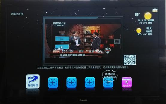 主界面上包括預覽直播快捷窗口,以及泰信電視直播、四個預留快捷方式及我的應用等快捷入口。考慮到個性化的需求,用戶可以自定義四個預留快捷方式,選擇自己喜愛的網絡視頻客戶端、網站、應用亦或者游戲,建立快捷方式,運行更快更直接,方便快捷。
