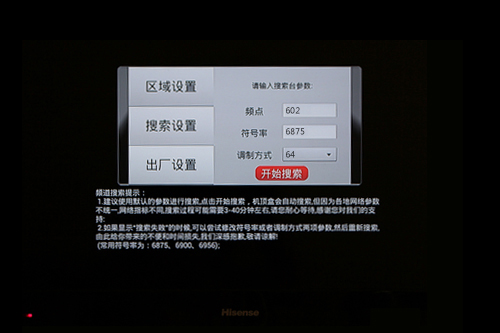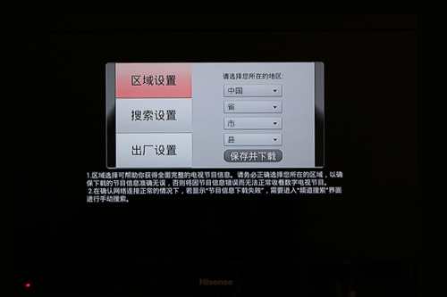 此時選中“電視直播”,系統會彈出區域設置的提示。我們可以設置區域點擊“保存并下載”;也可以選中搜索設置,點擊“開始搜索”按鈕,同樣可以搜到廣電提供的電視節目。總之,設置好節目列表之后,我們就可以順利觀看有線電視直播節目了。