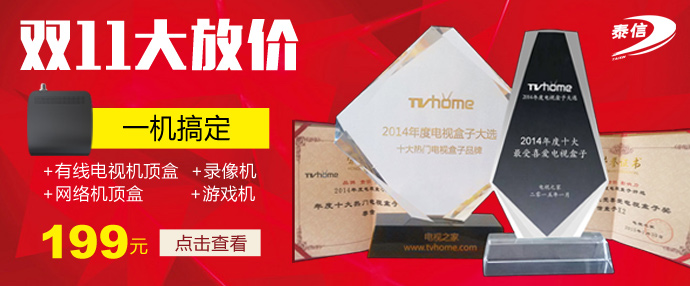 技術創新贏得產品領先!泰信盒子是國內首款集廣電有線電視、網絡電視、錄像機、游戲機于一體的全國市場化銷售的融合型智能機頂盒。泰信盒子X2榮膺2014年度十大最受喜愛的電視盒子及品牌。爆款好機惠迎國慶,購機不必等到雙11!心動的小伙伴千萬不要錯過哦!