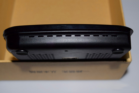 底面滿布散熱孔,四周四個橡膠防滑腳墊,有利于散熱,中央銘牌標注了出廠信息。
