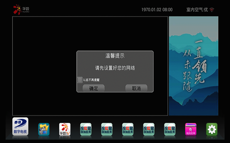 泰信盒子的UI界面凸顯有線電視的地位。當正確連接RF同軸線,插入智能卡并設置完畢后,將在UI界面中央顯示有線電視實時畫面,并在數秒后自動跳轉進有線電視全屏模式。
