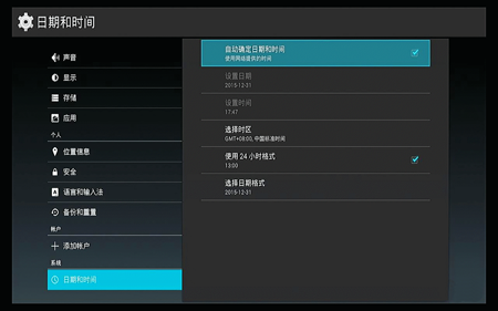 泰信盒子UI首頁的時間和天氣顯示需要連接網絡后才會更新,點擊自動確定日期和時間等待數秒后,設置內日期和時間會更新,首頁時間也會同步更新。