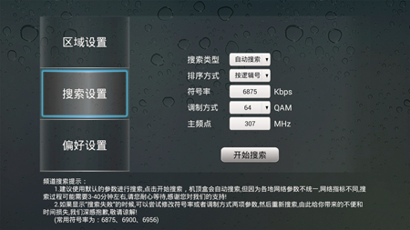搜索設置一般不需要更改參數,直接搜索即可,若遇到當地有線符號率,調制方式和主頻點不同時,須咨詢客服后填寫搜索,此過程大約需要3分鐘左右,即可以獲得當地所有有線電視節目頻道列表。