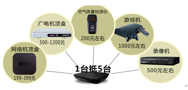 省錢好幫手!二十年技術(shù)積淀的融合型智能機(jī)頂盒可以將廣電有線電視、網(wǎng)絡(luò)電視、空氣質(zhì)量檢測儀、錄像機(jī)、游戲機(jī)等合為一體,只花一份錢就可以擁有諸多的功能,何樂而不為?家中的老舊機(jī)頂盒壞了,不用再高價(jià)購買廣電機(jī)頂盒;想看網(wǎng)絡(luò)點(diǎn)播,不用另花錢購買網(wǎng)絡(luò)機(jī)頂盒;關(guān)注室內(nèi)空氣環(huán)境,不用另買各種檢測儀;廣電有線電視錄制功能,不會(huì)讓您因?yàn)殄e(cuò)過精彩有線電視節(jié)目而遺憾;下載安裝游戲軟件,它就變身游戲機(jī)!