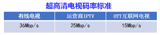 要高質(zhì)量傳輸超高清電視、保證良好的用戶體驗,超高清視頻的傳輸必須保障峰值帶寬。目前能夠比較低成本傳輸4K超高清的是有線電視DVB C網(wǎng)絡(luò)。DVB C普遍使用單信道64QAM調(diào)制,最高只能傳輸38M的碼流,所以有線電視的超高清節(jié)目碼率被定義在了36M。