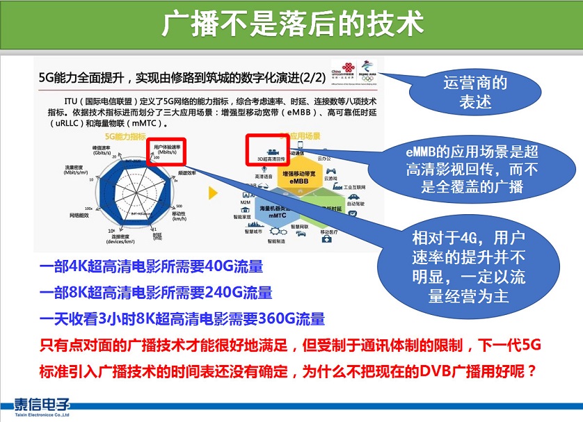 的確,5G模塊的提供者或一些賣機頂盒的人就是這么想的。但5G畢竟是無線傳輸,永遠沒有有線傳輸可靠,所以重要直播事件,比如春晚、大閱兵還是需要大量的線纜與5G并行保障。在向每個家庭傳輸?shù)臅r候,也是同樣的道理,有線比無線更可靠、成本更低。