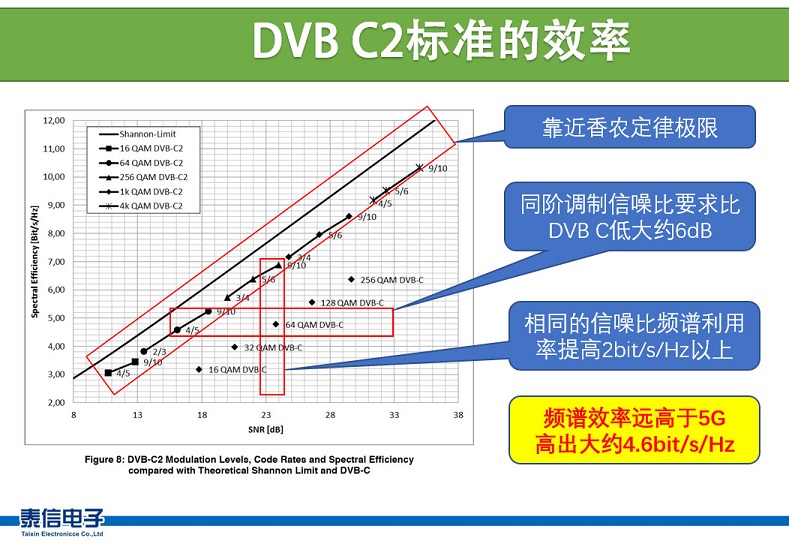 DVB C2的4096QAM調(diào)制效率也遠高于5G的256QAM,與現(xiàn)在普遍使用的DVB C標準相比可提升1倍數(shù)據(jù)帶寬,是可與現(xiàn)有DVB C同網(wǎng)傳輸、可立即實施的技術(shù)。