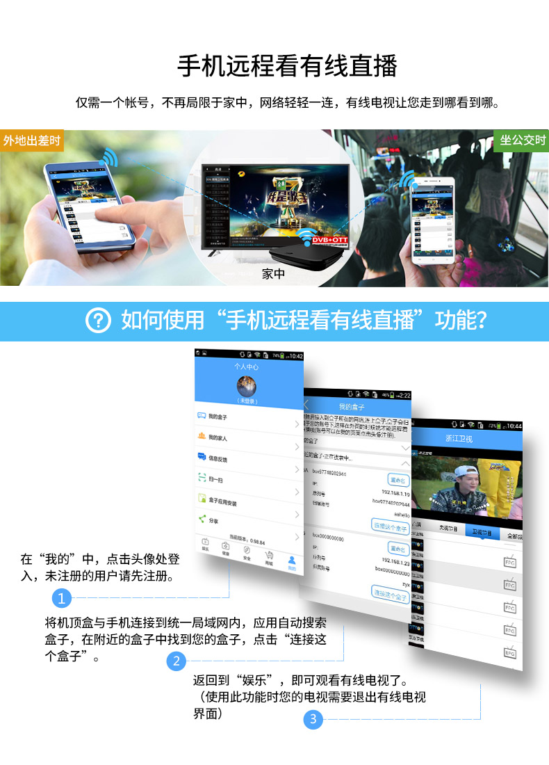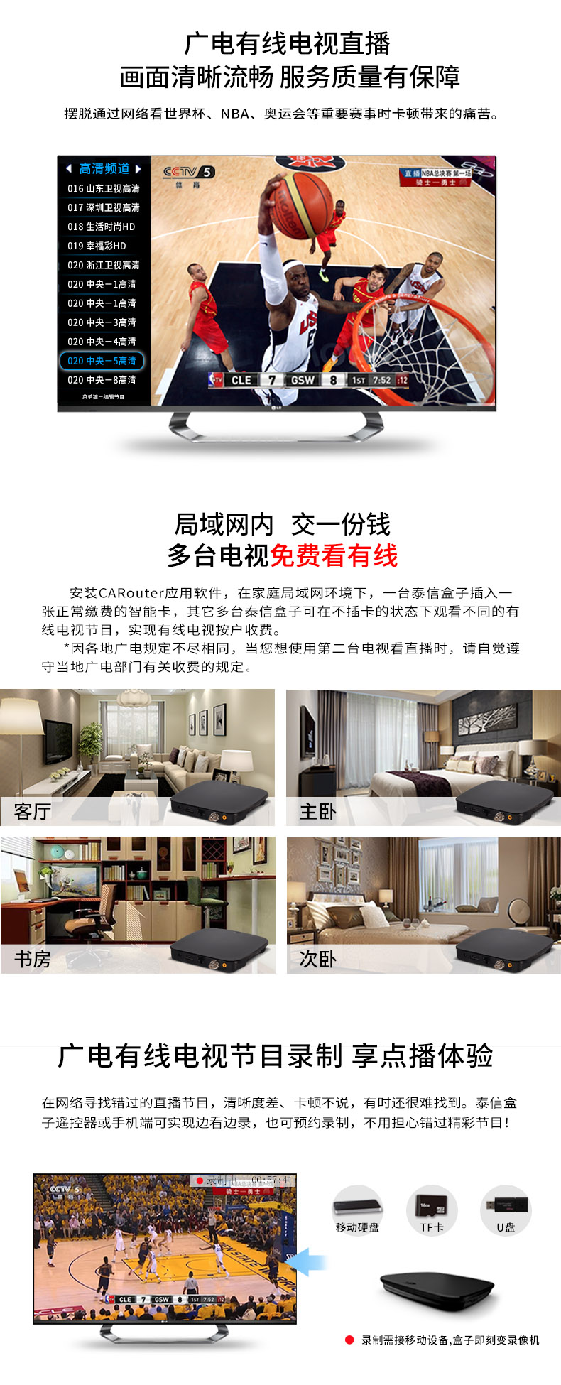 每臺泰信盒子連接廣電有線信號,并連接到家中的寬帶網(wǎng),將一張正常繳費的廣電智能卡插入其中一臺泰信盒子,其它的泰信盒子無需插卡就可以收看有線電視節(jié)目,且可獨立換臺,相互不受影響。